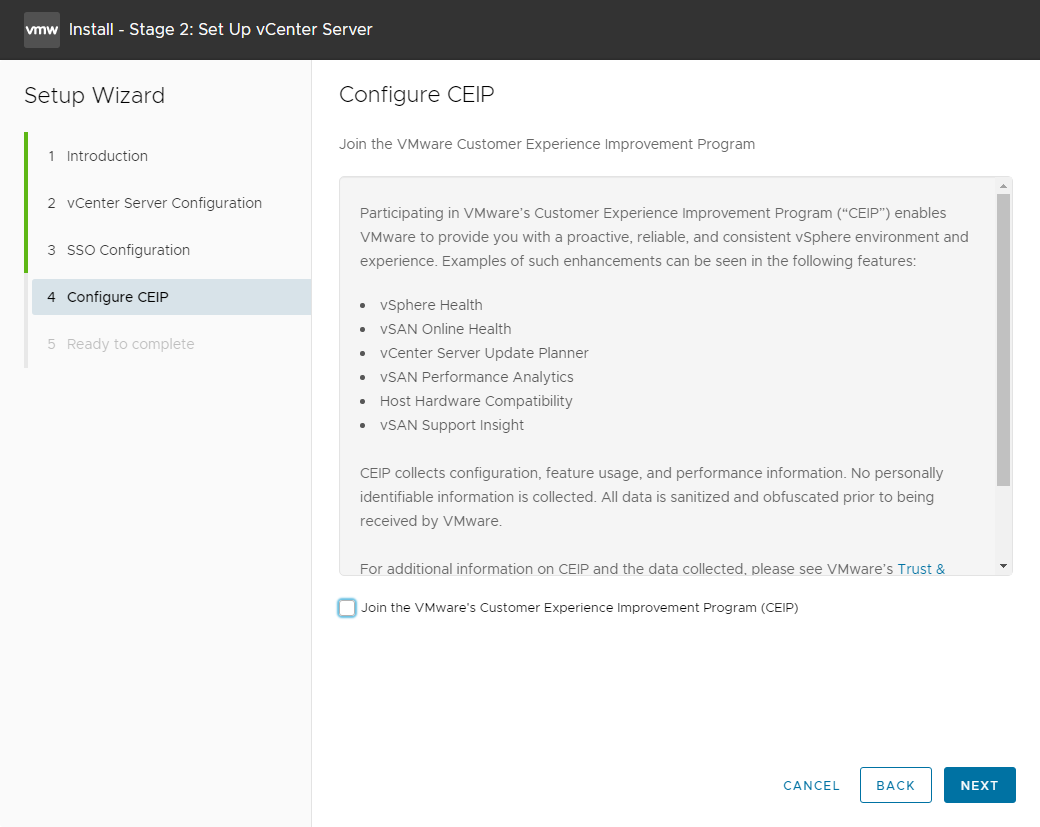 VMware CEIP(고객 환경 향상 프로그램) 참여하려면 체크